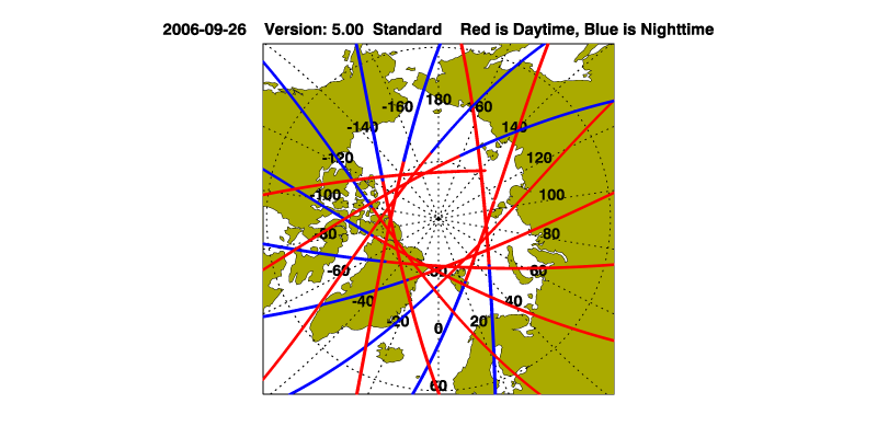 The orbit track locations for the entire Level 1 .hdf file are in black and the orbit track locations corresponding to this page are color coded.