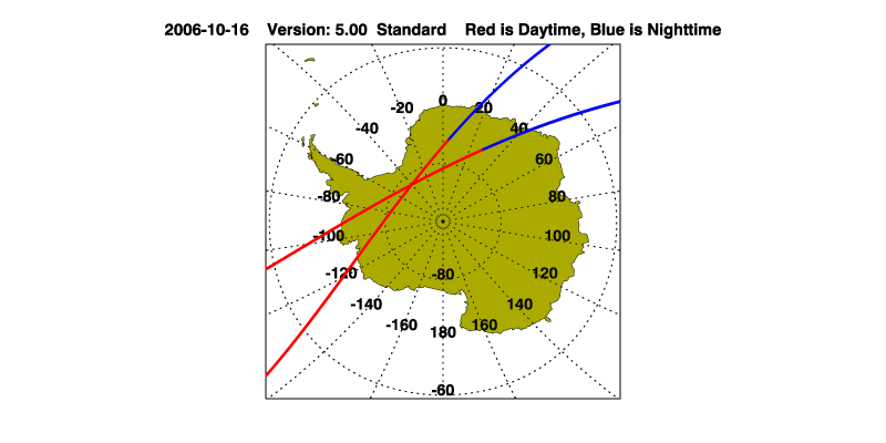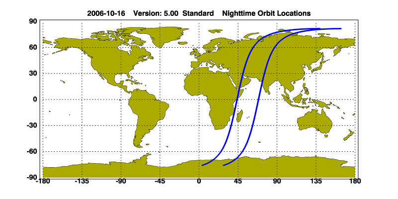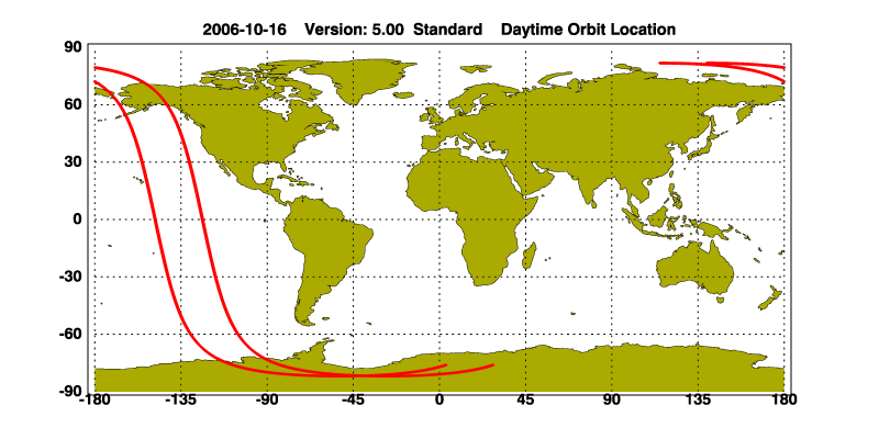 The orbit track locations for the entire Level 1 .hdf file are in black and the orbit track locations corresponding to this page are color coded.