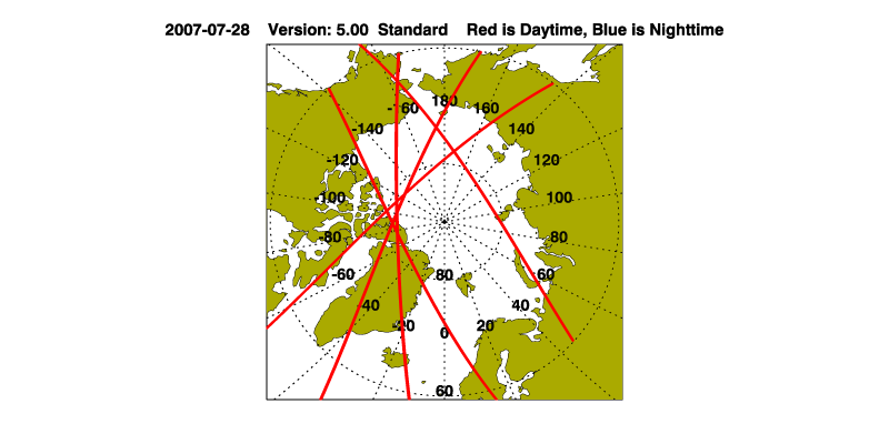 The orbit track locations for the entire Level 1 .hdf file are in black and the orbit track locations corresponding to this page are color coded.