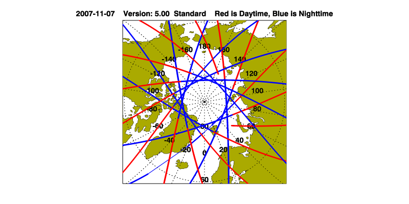 The orbit track locations for the entire Level 1 .hdf file are in black and the orbit track locations corresponding to this page are color coded.