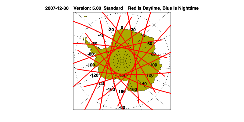 The orbit track locations for the entire Level 1 .hdf file are in black and the orbit track locations corresponding to this page are color coded.