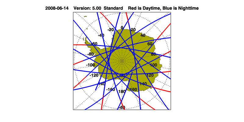 The orbit track locations for the entire Level 1 .hdf file are in black and the orbit track locations corresponding to this page are color coded.