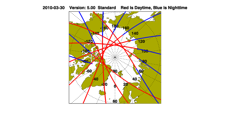 The orbit track locations for the entire Level 1 .hdf file are in black and the orbit track locations corresponding to this page are color coded.