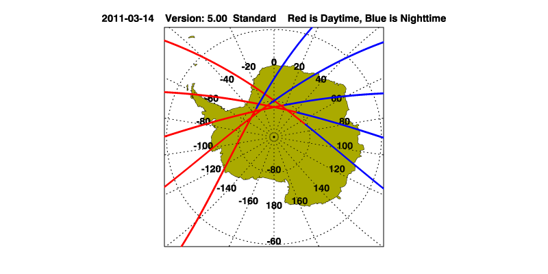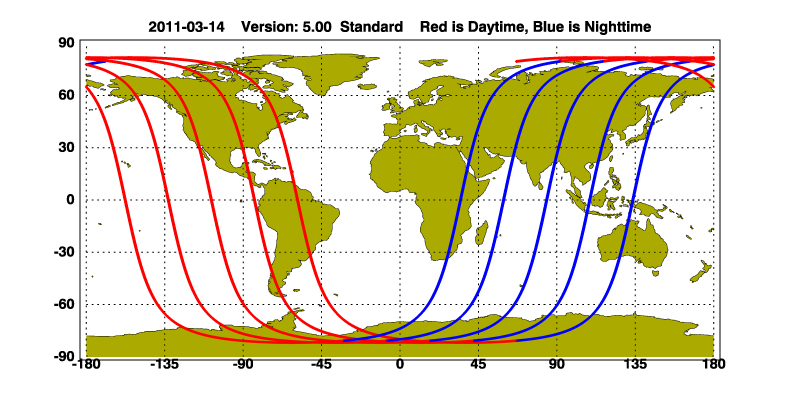 The orbit track locations for the entire Level 1 .hdf file are in black and the orbit track locations corresponding to this page are color coded.