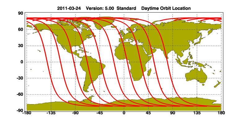 The orbit track locations for the entire Level 1 .hdf file are in black and the orbit track locations corresponding to this page are color coded.