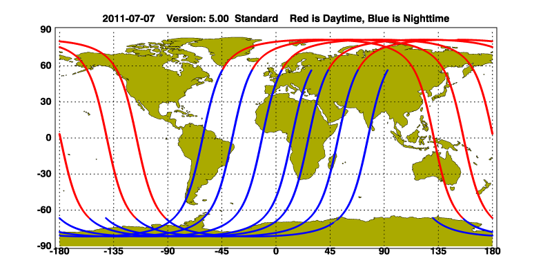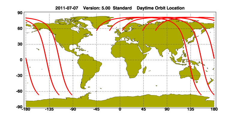 The orbit track locations for the entire Level 1 .hdf file are in black and the orbit track locations corresponding to this page are color coded.