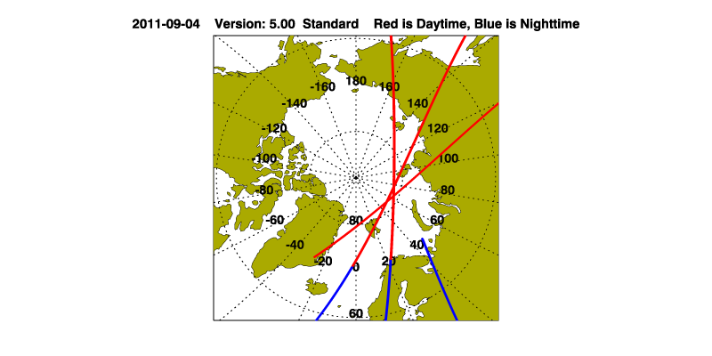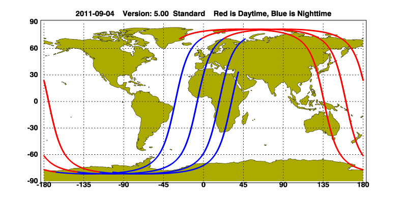 The orbit track locations for the entire Level 1 .hdf file are in black and the orbit track locations corresponding to this page are color coded.