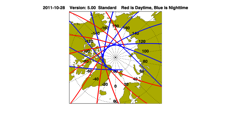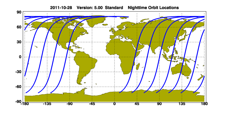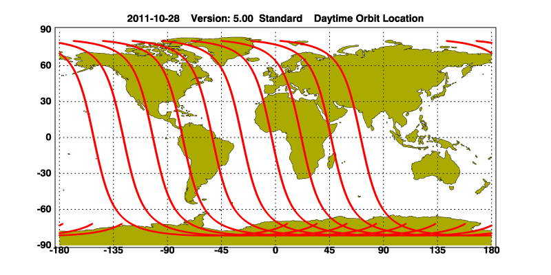 The orbit track locations for the entire Level 1 .hdf file are in black and the orbit track locations corresponding to this page are color coded.