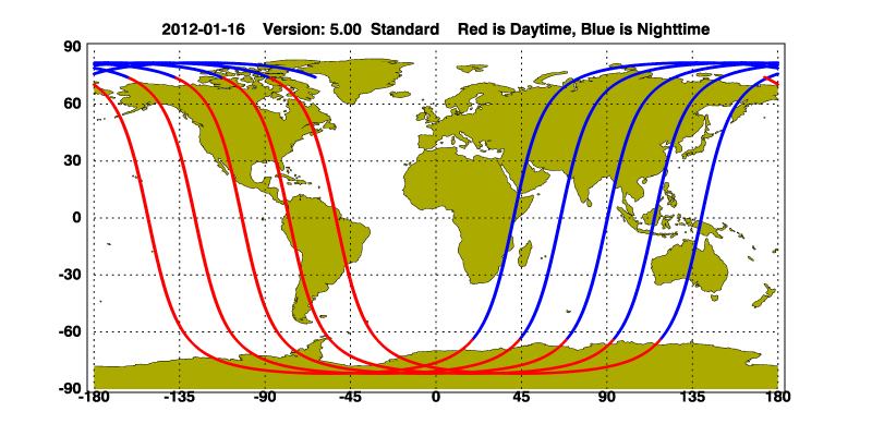 The orbit track locations for the entire Level 1 .hdf file are in black and the orbit track locations corresponding to this page are color coded.