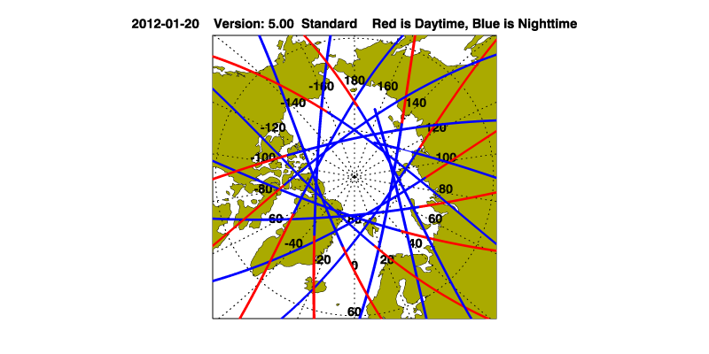 The orbit track locations for the entire Level 1 .hdf file are in black and the orbit track locations corresponding to this page are color coded.