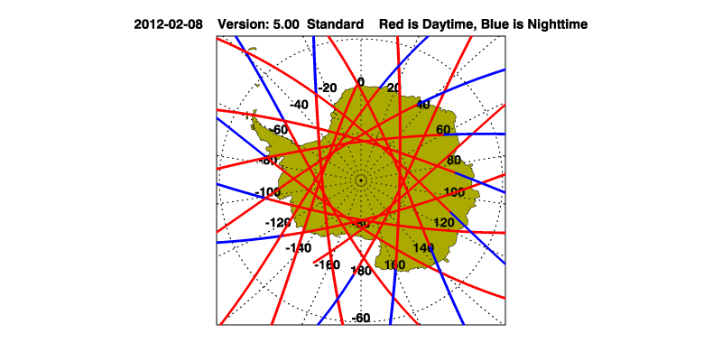 The orbit track locations for the entire Level 1 .hdf file are in black and the orbit track locations corresponding to this page are color coded.