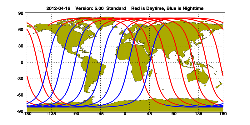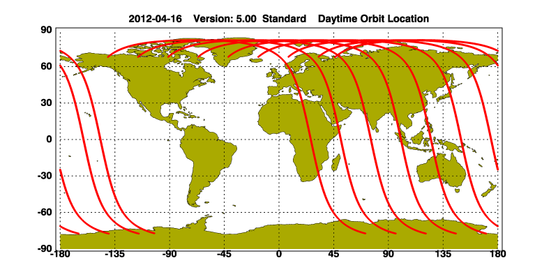 The orbit track locations for the entire Level 1 .hdf file are in black and the orbit track locations corresponding to this page are color coded.