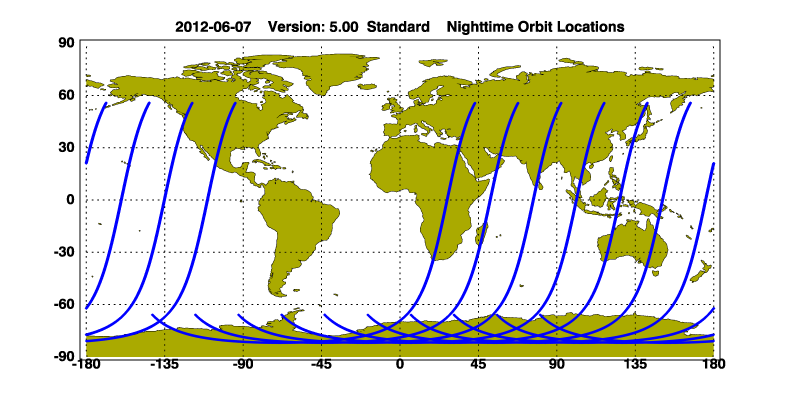 The orbit track locations for the entire Level 1 .hdf file are in black and the orbit track locations corresponding to this page are color coded.