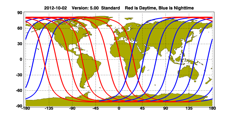 The orbit track locations for the entire Level 1 .hdf file are in black and the orbit track locations corresponding to this page are color coded.
