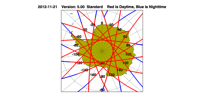 The orbit track locations for the entire Level 1 .hdf file are in black and the orbit track locations corresponding to this page are color coded.