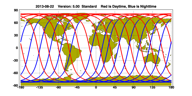 The orbit track locations for the entire Level 1 .hdf file are in black and the orbit track locations corresponding to this page are color coded.