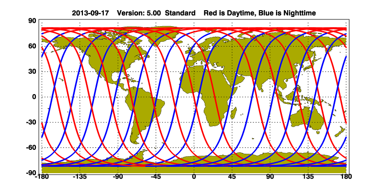 The orbit track locations for the entire Level 1 .hdf file are in black and the orbit track locations corresponding to this page are color coded.