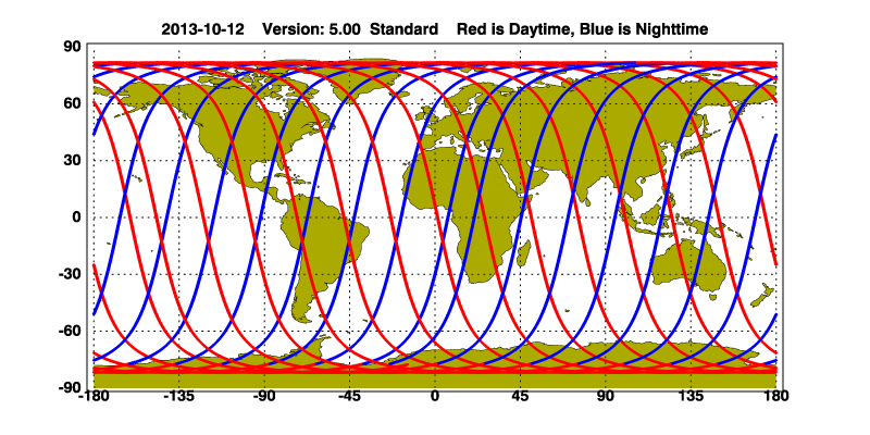 The orbit track locations for the entire Level 1 .hdf file are in black and the orbit track locations corresponding to this page are color coded.