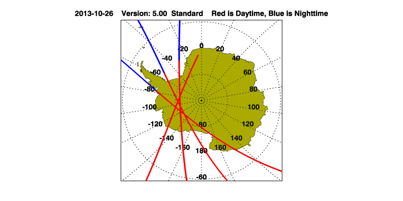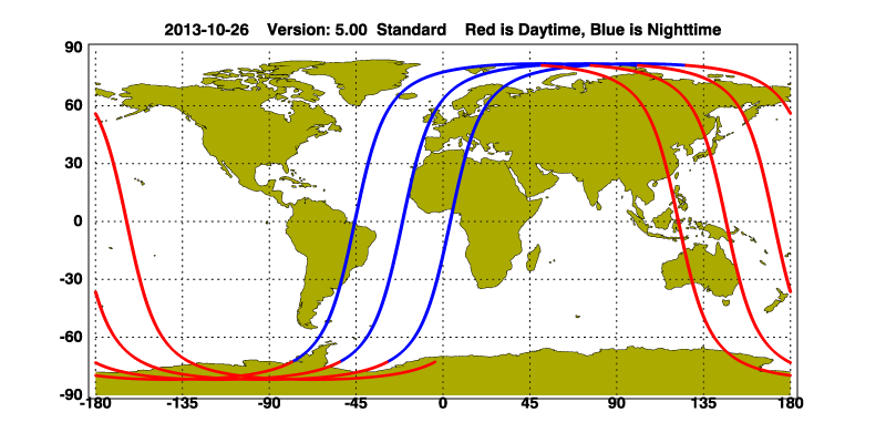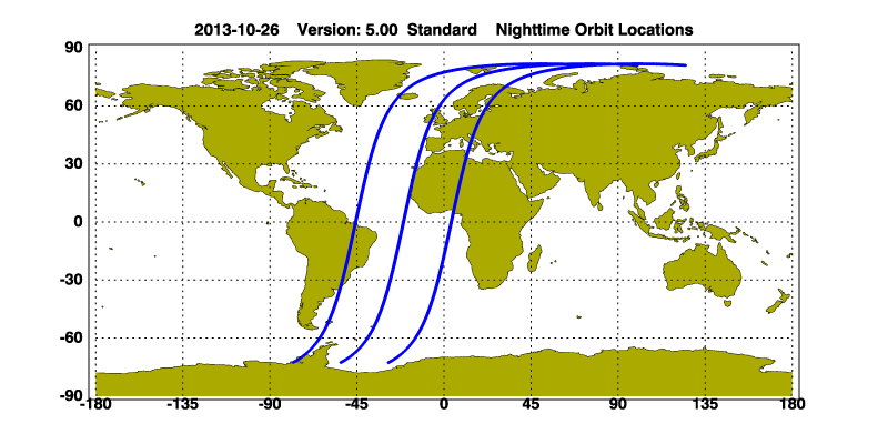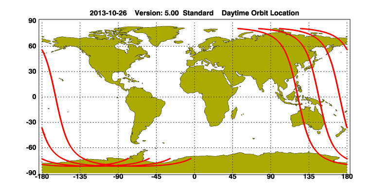The orbit track locations for the entire Level 1 .hdf file are in black and the orbit track locations corresponding to this page are color coded.