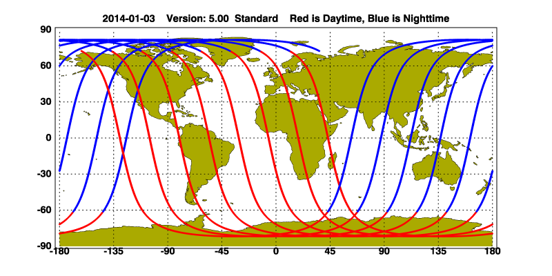 The orbit track locations for the entire Level 1 .hdf file are in black and the orbit track locations corresponding to this page are color coded.