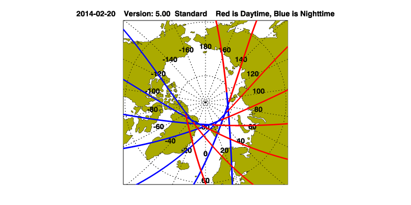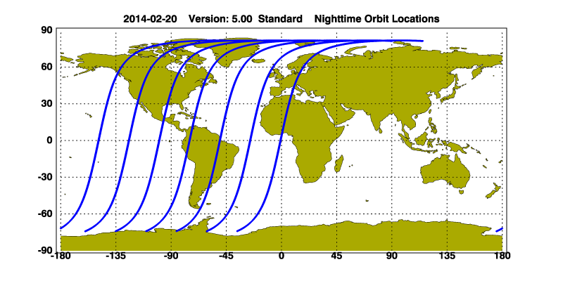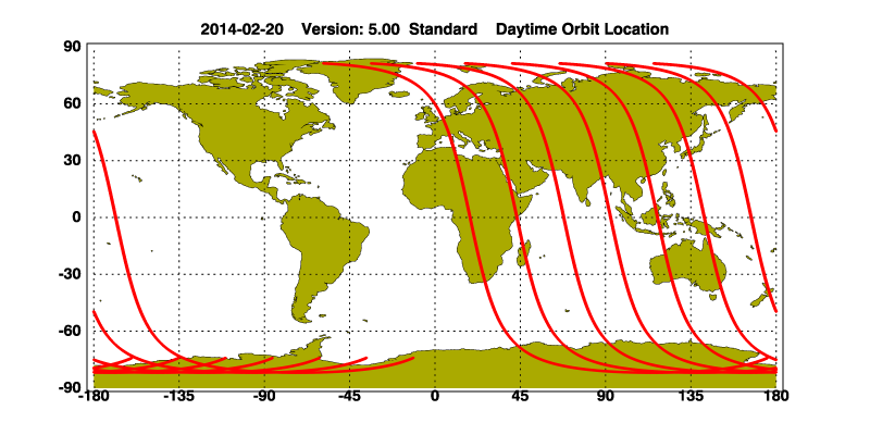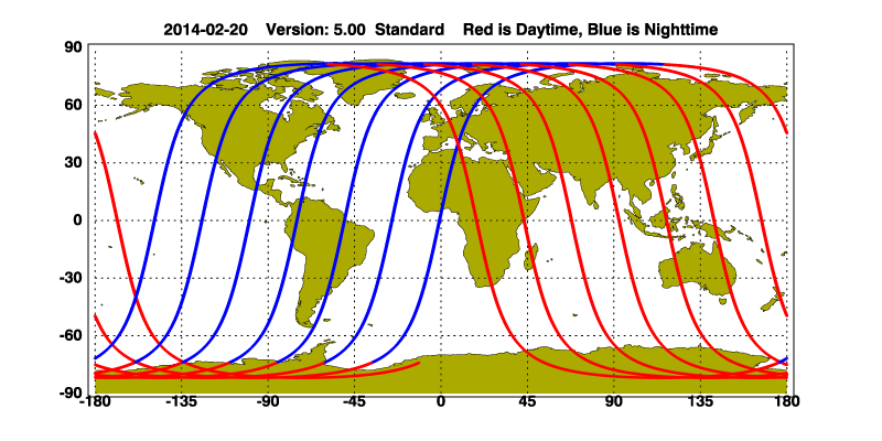 The orbit track locations for the entire Level 1 .hdf file are in black and the orbit track locations corresponding to this page are color coded.