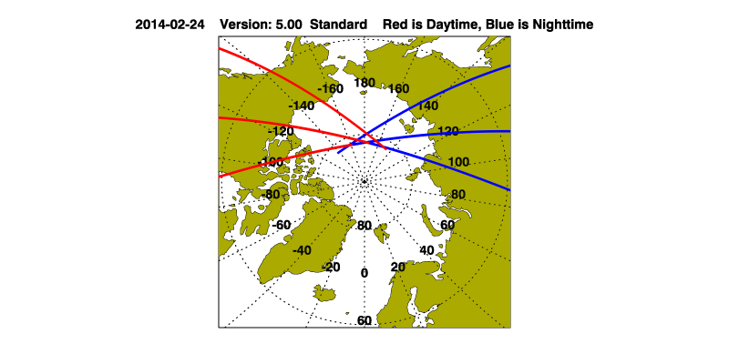 The orbit track locations for the entire Level 1 .hdf file are in black and the orbit track locations corresponding to this page are color coded.