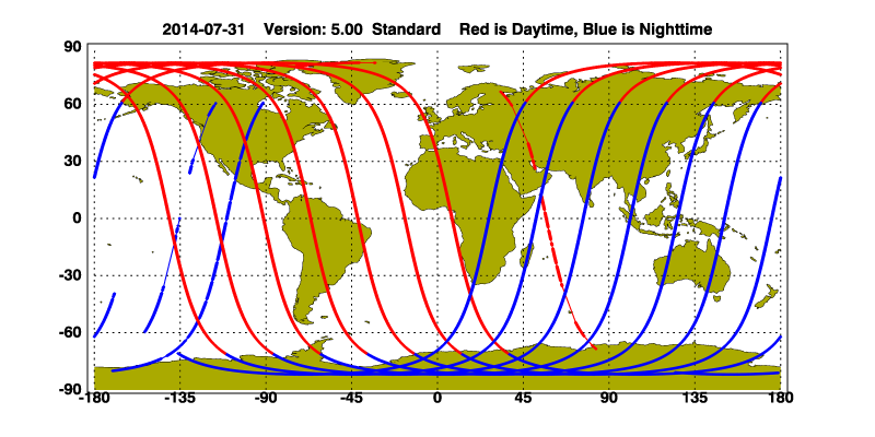 The orbit track locations for the entire Level 1 .hdf file are in black and the orbit track locations corresponding to this page are color coded.