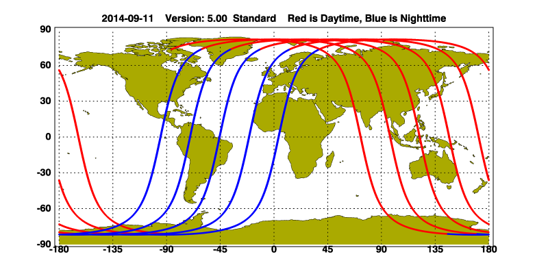 The orbit track locations for the entire Level 1 .hdf file are in black and the orbit track locations corresponding to this page are color coded.