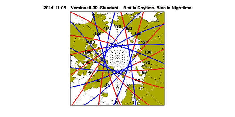 The orbit track locations for the entire Level 1 .hdf file are in black and the orbit track locations corresponding to this page are color coded.
