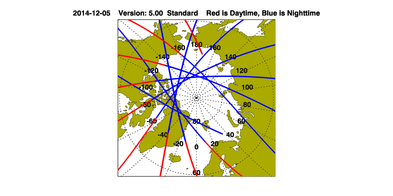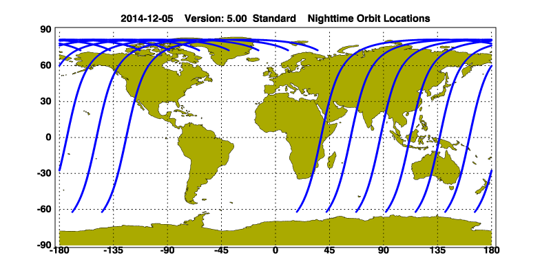 The orbit track locations for the entire Level 1 .hdf file are in black and the orbit track locations corresponding to this page are color coded.