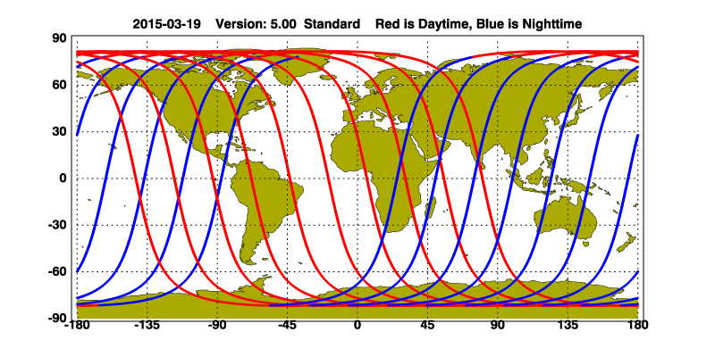 The orbit track locations for the entire Level 1 .hdf file are in black and the orbit track locations corresponding to this page are color coded.