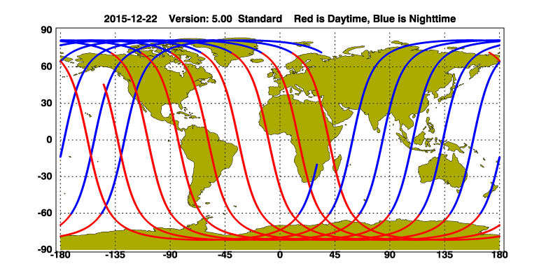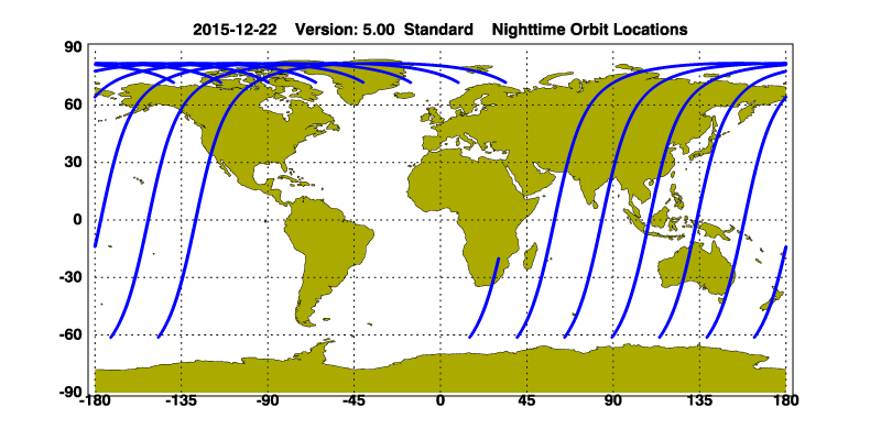 The orbit track locations for the entire Level 1 .hdf file are in black and the orbit track locations corresponding to this page are color coded.