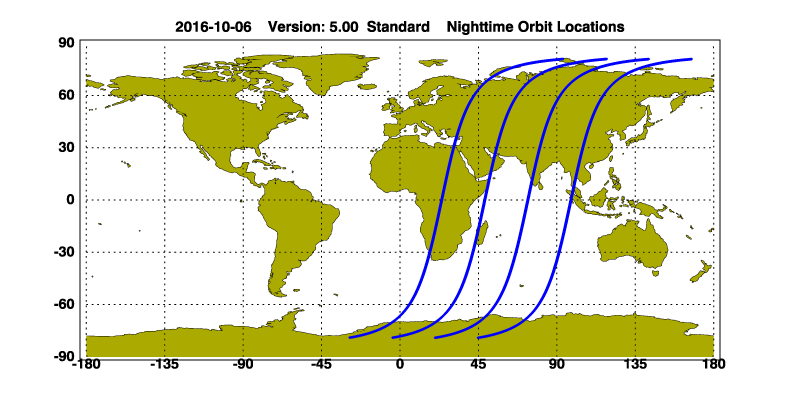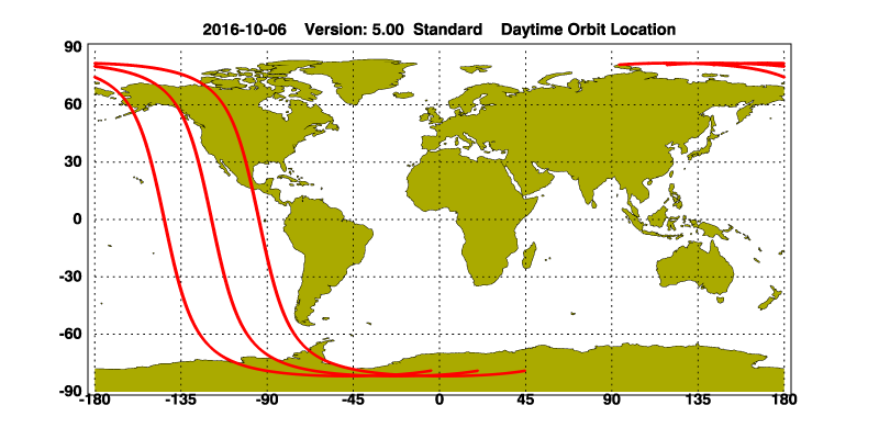 The orbit track locations for the entire Level 1 .hdf file are in black and the orbit track locations corresponding to this page are color coded.