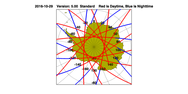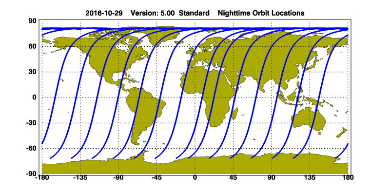 The orbit track locations for the entire Level 1 .hdf file are in black and the orbit track locations corresponding to this page are color coded.