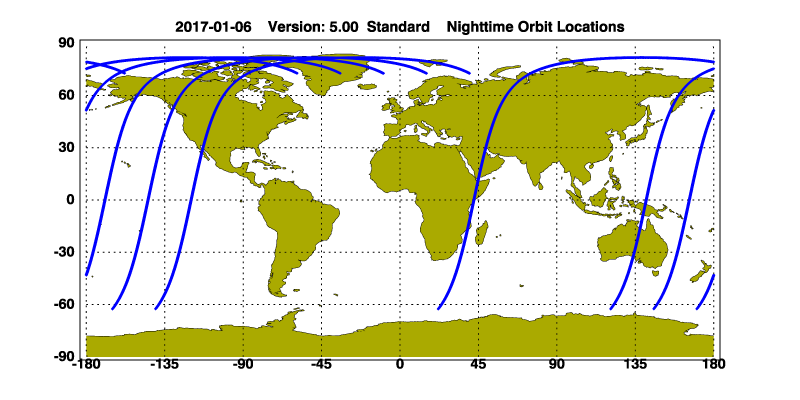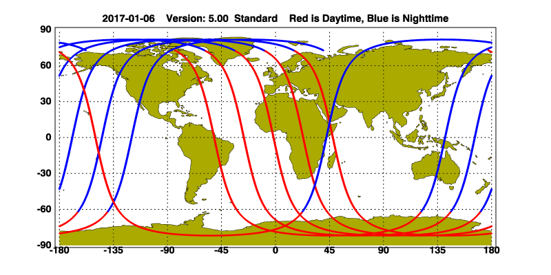 The orbit track locations for the entire Level 1 .hdf file are in black and the orbit track locations corresponding to this page are color coded.