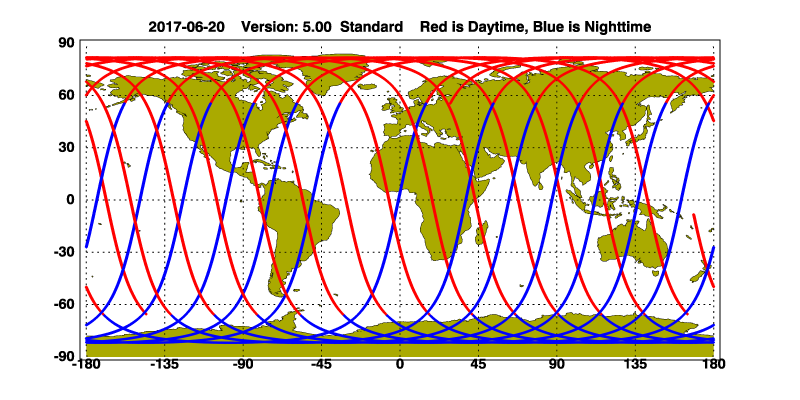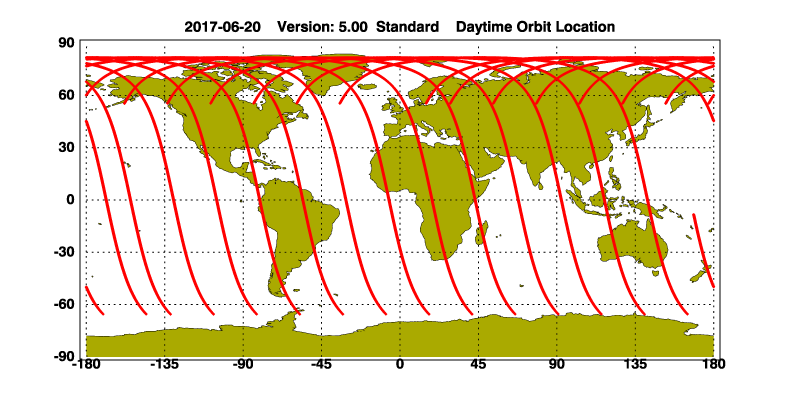 The orbit track locations for the entire Level 1 .hdf file are in black and the orbit track locations corresponding to this page are color coded.