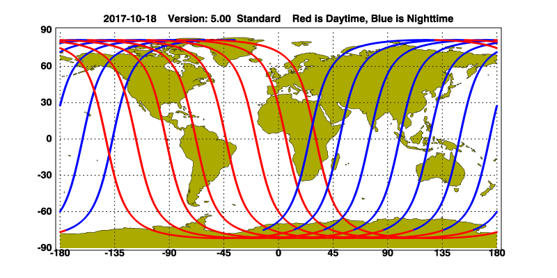 The orbit track locations for the entire Level 1 .hdf file are in black and the orbit track locations corresponding to this page are color coded.