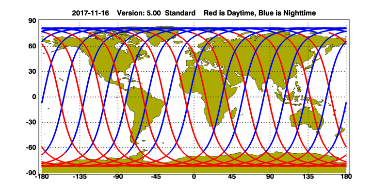 The orbit track locations for the entire Level 1 .hdf file are in black and the orbit track locations corresponding to this page are color coded.