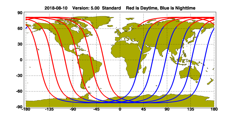 The orbit track locations for the entire Level 1 .hdf file are in black and the orbit track locations corresponding to this page are color coded.