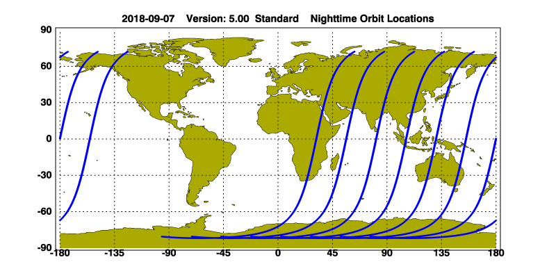 The orbit track locations for the entire Level 1 .hdf file are in black and the orbit track locations corresponding to this page are color coded.