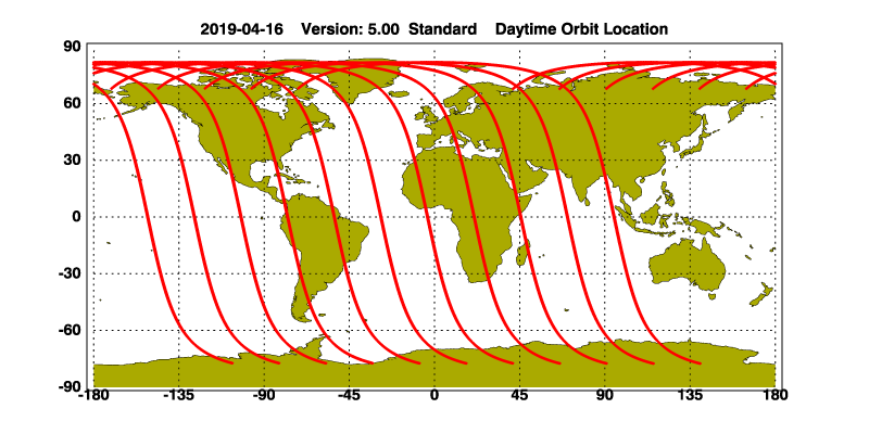 The orbit track locations for the entire Level 1 .hdf file are in black and the orbit track locations corresponding to this page are color coded.