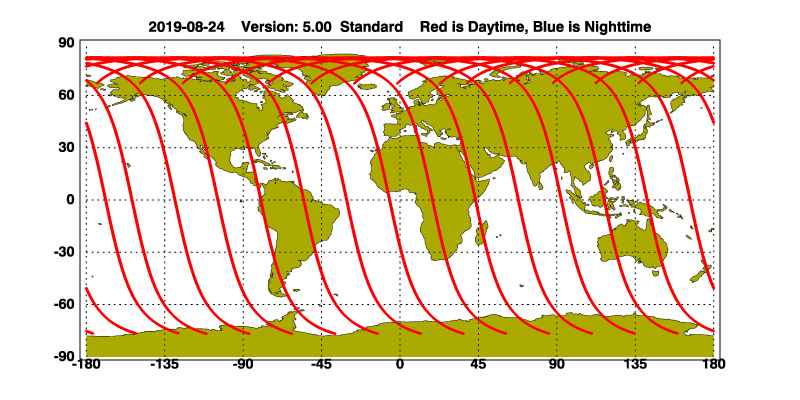 The orbit track locations for the entire Level 1 .hdf file are in black and the orbit track locations corresponding to this page are color coded.