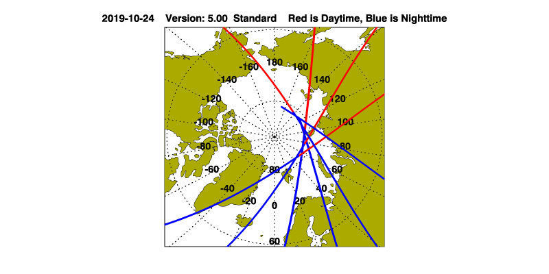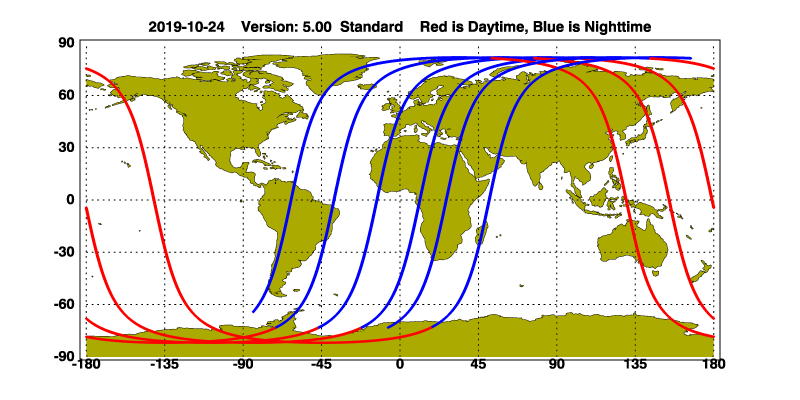 The orbit track locations for the entire Level 1 .hdf file are in black and the orbit track locations corresponding to this page are color coded.