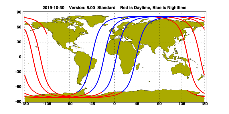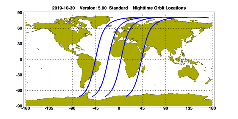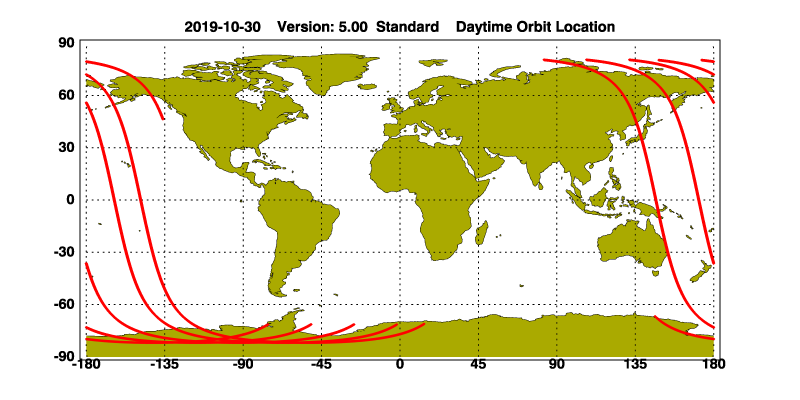 The orbit track locations for the entire Level 1 .hdf file are in black and the orbit track locations corresponding to this page are color coded.