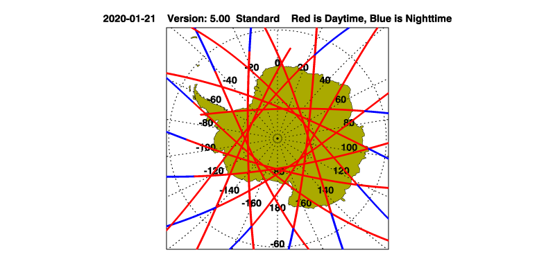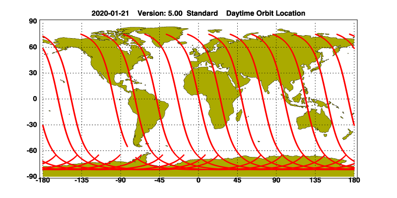 The orbit track locations for the entire Level 1 .hdf file are in black and the orbit track locations corresponding to this page are color coded.