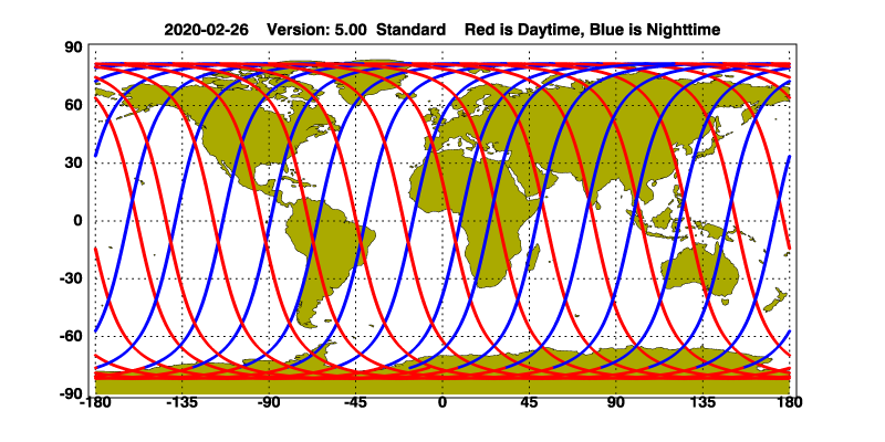 The orbit track locations for the entire Level 1 .hdf file are in black and the orbit track locations corresponding to this page are color coded.