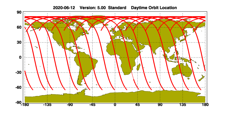 The orbit track locations for the entire Level 1 .hdf file are in black and the orbit track locations corresponding to this page are color coded.