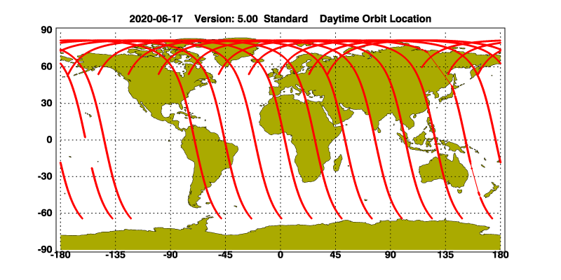 The orbit track locations for the entire Level 1 .hdf file are in black and the orbit track locations corresponding to this page are color coded.