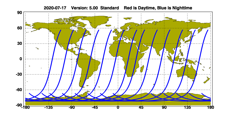 The orbit track locations for the entire Level 1 .hdf file are in black and the orbit track locations corresponding to this page are color coded.