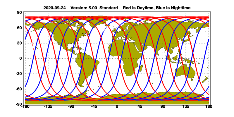 The orbit track locations for the entire Level 1 .hdf file are in black and the orbit track locations corresponding to this page are color coded.
